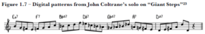 John Coltrane used digital patterns extensively to solo through the challenging, fast moving chords in his composition “Giant Steps”: