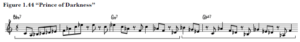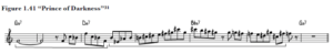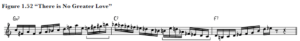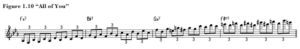 The opposite of generalization, harmonic superimposition, occurs when the soloist imposes their own alterations over the harmony. This mostly occurs over longer chord changes, as seen in Figure 1.41 below.