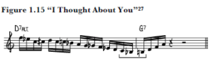 Similarly, in Figure 1.43, Hancock anticipates the change to D7alt by 2 beats. Bar-line shifting is also often be strongly related to harmonic generalization, as is Figure 1.44.