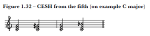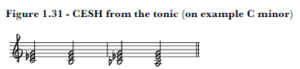 Pronounced “Kesh”, this terminology comes from the initials of a device called Contrapuntal Elaboration of Static Harmony. It comes in two primary forms, demonstrated below – note the principal of each example applies to both major and minor tonalities.