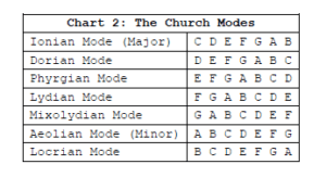 Dies war die Grundlage der westeuropäischen Modaltheorie des Mittelalters und der Renaissance – eine Theorie, in der eine Grundtonleiter (die diatonische Tonleiter, die den weißen Noten der Tastatur entspricht) letztendlich als Grundlage für sieben verschiedene Modi diente, von denen jeder gefühlt wurde, haben ihren eigenen einzigartigen psychologischen und symbolischen Charakter:
