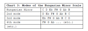Der unternehmungslustige Musiker von heute kann ebenfalls „Modi“ auf der Grundlage einer exotischen (nicht-diatonischen) Tonleiter konstruieren, was noch mehr Beugungen oder tonale Dialekte, noch mehr musikalische Vielfalt ergibt. Zum Beispiel würden die auf der ungarischen Moll-Tonleiter basierenden Modi so beginnen: