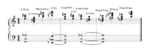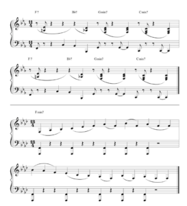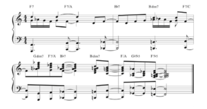 Many of Brubeck’s classic compositions were based on blues progressions, like “Sweet Cleo Brown,” a tribute to one of his great inspirations, blues singer Cleo Brown. Similarly, his solos were often infused with riffs drawn from the blues scale. Ex. 1 is a progression Brubeck typically used to end a blues.