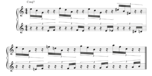 It was Brubeck’s older brother Howard, chairman of the music department at Palomar Junior College, who first suggested he study with French composer Darius Milhaud. During those studies, Brubeck began experimenting with polytonality—playing in more than one tonality at a time. While Brubeck is well known for his frequent display of fast pyrotechnics and dense textures, Ex. 5 exemplifies his use of space and openness.